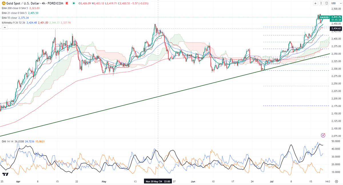 Gold pared some of its gains due to profit booking. It hit a low of $2451 at the time of writing and is currently trading around $2471.