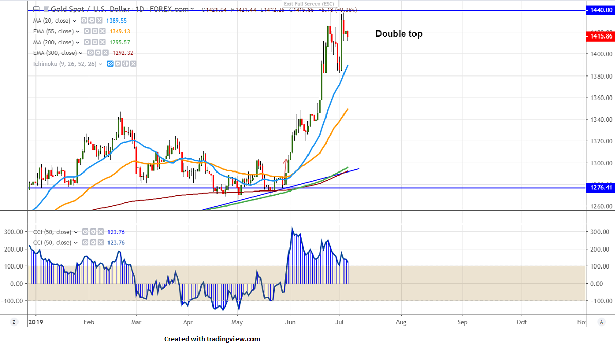 On the flip side, near term support is around $1412 and any break below will drag the yellow metal to the next level till $1409 (5 and 34 H EMA)/$1400/$1391 (300 H EMA). Major weakness only below $1380.