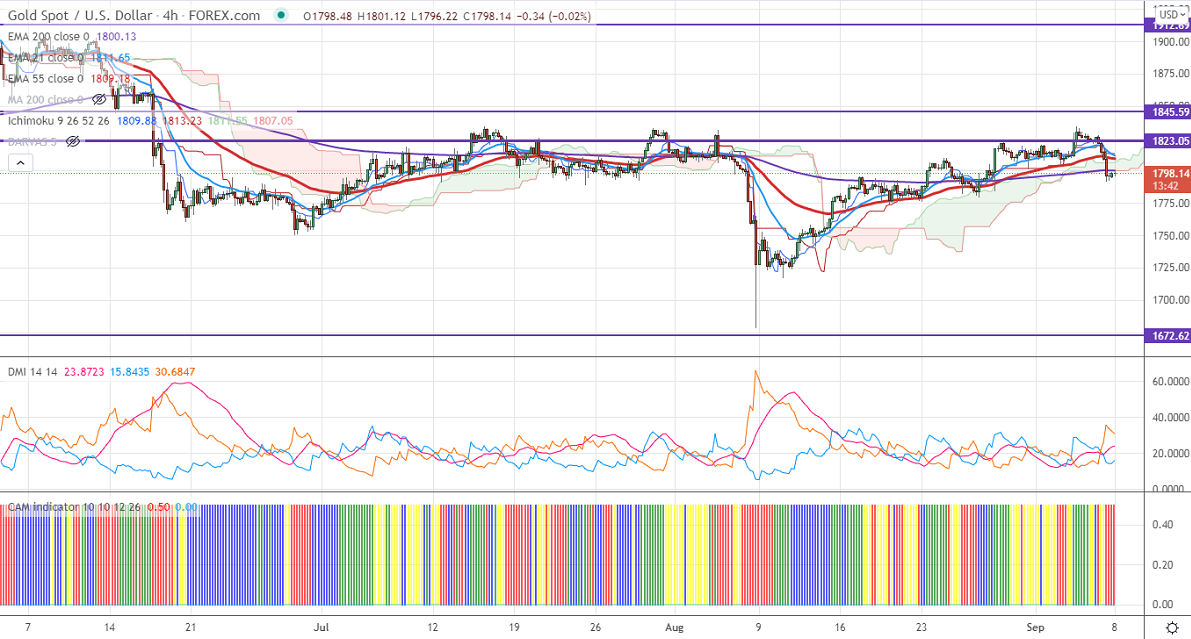Gold has lost more than $30 from the high of $1834 made after dismal US jobs data. The regain in the US dollar index and surging US Treasury yields are putting pressure on the yellow metal at higher levels. The dollar index is holding above 92.50 levels, any breach above 92.60 (200-4H EMA) confirms further bullishness. The yellow metal hits a low of $1792 yesterday and is currently trading around $1798.10.