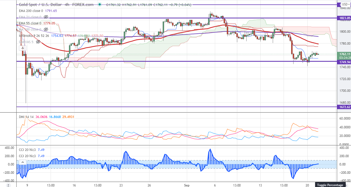 Gold showed a minor pullback after a more than $50 decline in the global financial crisis. The entire global stock markets plummet sharply due to Chinese property developer Evergrande's debt crisis. Markets eye US Fed monetary policy tomorrow for further direction.DXY lost more than 30 pips from a minor top of 93.45. Any breach above 93.75 confirms further bullishness. The yellow metal hits a low of $1766.16 and is currently trading around $1761.97.