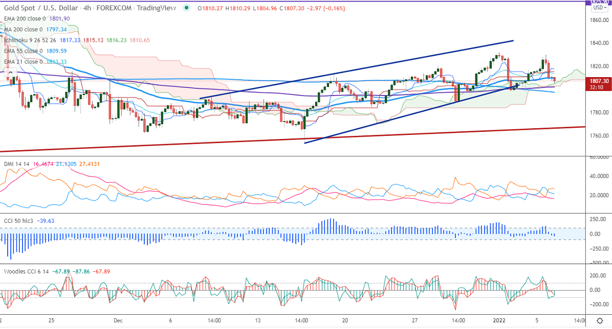 Gold continues to trade lower after hawkish FOMC meeting minutes. The Fed meeting minutes signaled for an earlier rate hike as expected. The 10-year yield hits 1-1/2 month at 1.71%, the highest level since October of last year. The spread of the omicron virus in the US is preventing the yellow metal from further sell-off. It hits a low of $1798 and is currently trading around $1803.75.