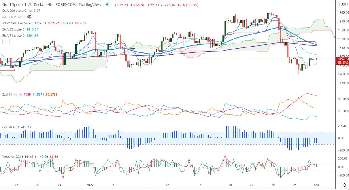 Gold regained after hitting a low of $1780 on US dollar weakness. Asian markets remain subdued on the Chinese New year holidays. Markets eagerly await three central banks meeting this week and US NFP data for further direction. The Australian central bank has kept its rates unchanged and ended the bond-buying program as inflation rises faster than anticipated. The US dollar index lost nearly 100 pips after hitting a multi-week high of 97.44. Gold hits an intraday high of $1799.93 and is currently trading around $1797.36.