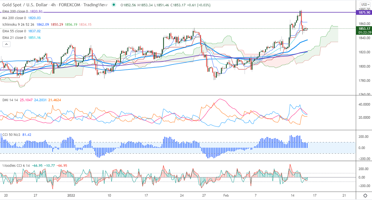 Gold lost more than $30 after Russia and Ukraine's tension de-escalated. The demand for riskier assets surged after Russia informed that some troops had withdrawn from the Ukraine border. Headline US PPI for Jan accelerated to 9.7 YoY vs 9.1 expected. Gold hits a low of $1844 and is currently trading around $1852.85.