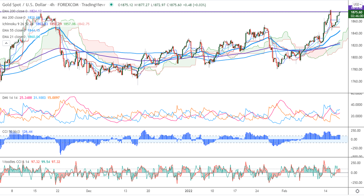 Gold regained sharply on Russia and Ukraine's geopolitical tension. US, NATO says that Russia is building up troops near Ukraine. It has increased demand for safe-haven assets like gold. US retail sales rose 3.8% in Jan compared to a forecast of 2.1%. Markets eye US jobless claims and Philly fed manufacturing index for further direction. Gold hits a low of $1879.55 and is currently trading around $1875.85.