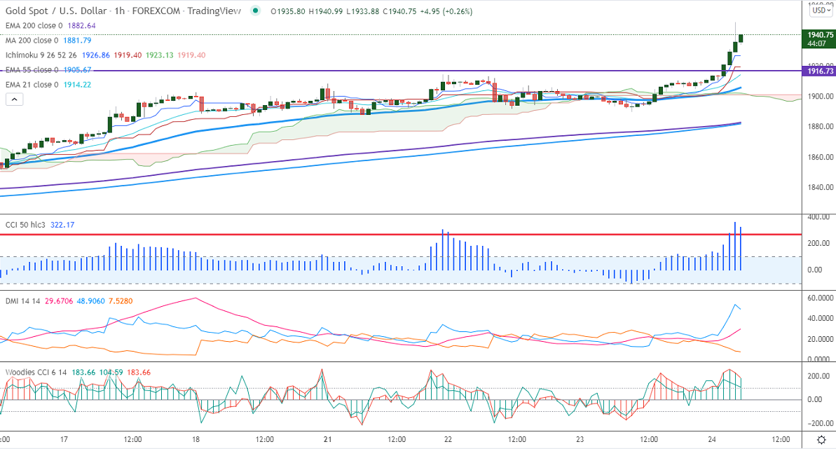 Gold hits a fresh 8-month high as geopolitical tension intensifies. Russian President Putin has announced military operations in Donbas and explosions heard in Ukraine cities of Odesa, Kharkiv. The increase in demand for safe-haven assets is pushing the yellow metal higher. US 10-year yield lost more than 7% from yesterday's high of 2%. Gold hits a high of $1949 and is currently trading around $1939.52.