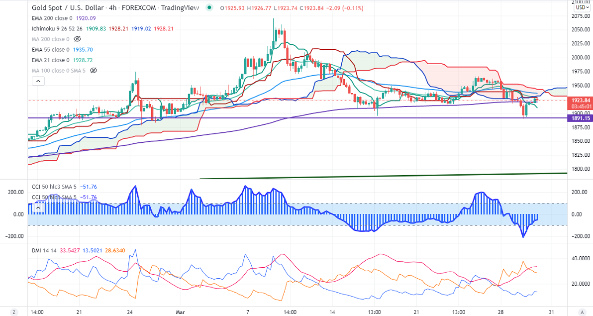 Gold regained slightly from a low of $1890 on the weak US dollar. The US dollar index lost its shine after Russia said that it will cut back military operations near Kyiv during peace talks. The minor profit booking US treasury yield also supports yellow metal at lower levels. It hits an intraday high of $1927.39 and is currently trading around $1926.30.