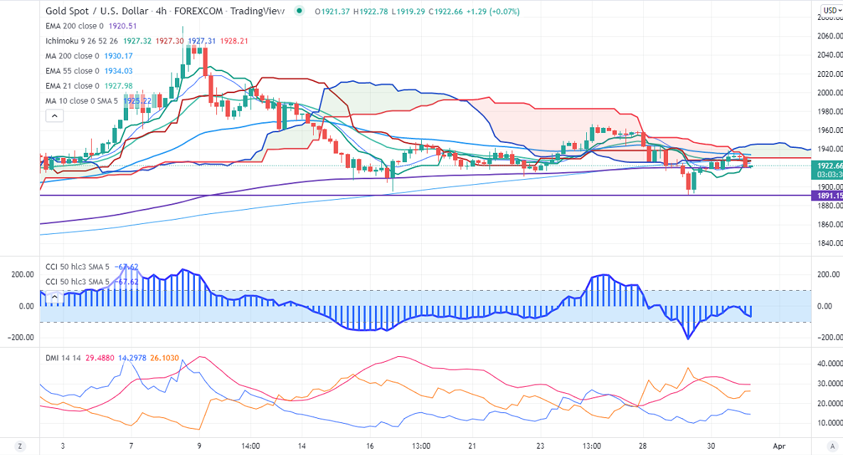 Gold continues to trade lower after showing a minor pullback. The hope of diplomacy between the Russia and Ukraine crisis has decreased demand for safe-haven assets like gold. The sell-off in the US dollar index and US treasury yields prevents further downside risks in the yellow metal. It hits an intraday high of $1920 and is currently trading around $1922.