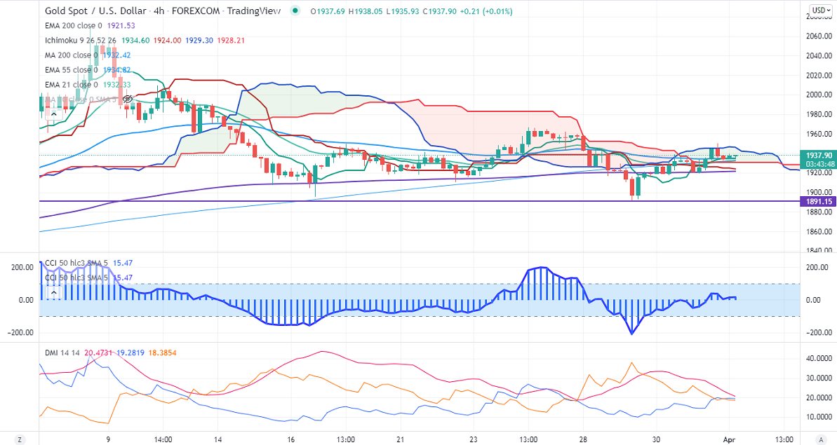 Gold is trading flat for the second consecutive day after hitting a high of $1949. Markets eye US Nonfarm payroll data for further direction. The economy expects to add 492K jobs in Mar compared to the previous month's 678K. The yellow metal hits an intraday low of $1932.60 and is currently trading around $1937.50.