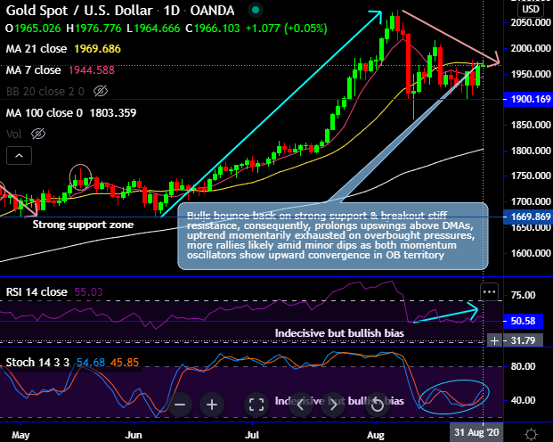 Technically, XAUUSD bulls bounce back on strong support of 1,901 levels but showing stiff resistance at 21-DMAs, consequently, the trend has been drifting in sideways upon overbought pressures. Thereby, the previous uptrend seems to be momentarily exhausted on overbought pressures.
