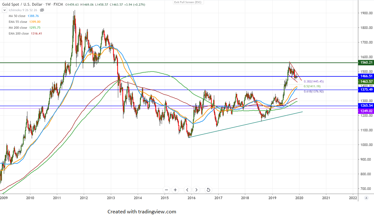 Gold was one of the best performers this year and jumped more than 20% till $1556. The jump was mainly due to ongoing trade war between the US and China which has increased demand for Safe-haven assets like the gold, yen. The three rate cut by Fed this year also supported the yellow metal prices at a lower level. It is currently trading around $1463.19.