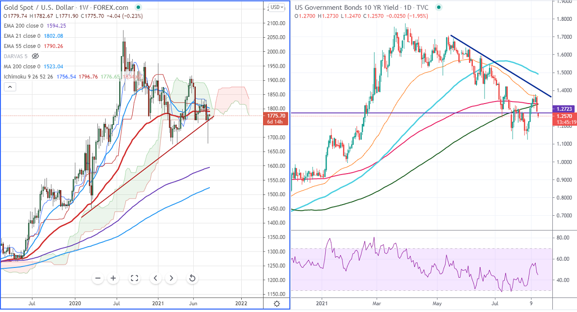 Gold surged sharply more than $30 on Friday after dismal US consumer confidence data. The University of Michigan consumer sentiment declined sharply to 70.20 for Aug, the lowest level since 2011. The US 10-year yield lost more than 5% after the data. The US dollar index is trading well below 93 levels, any breach below 92.65 confirms further bearishness. The Yellow metal hits an intraday high of $1782 and is currently trading around $1775.60.