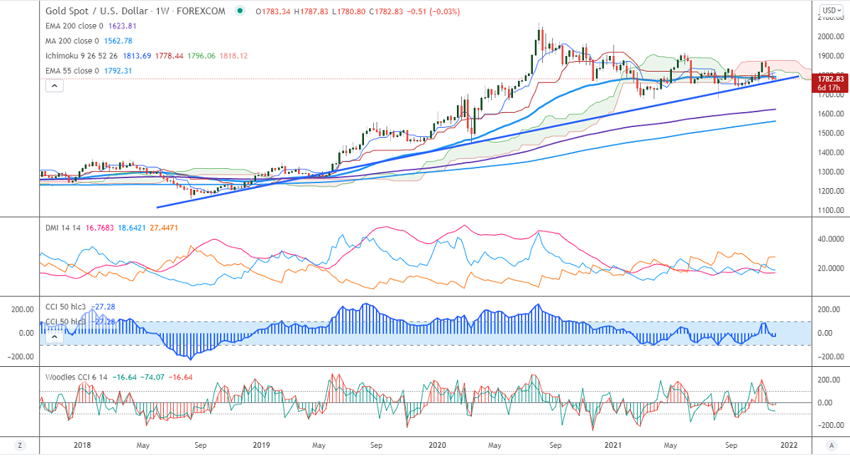 Gold is trading below $1800 for the second consecutive week. The minor weakness in US Non-farm payroll has prevented the yellow metal from further sell-off. The economy has added 210000 jobs in Nov compared to an estimate of 550000. The unemployment rate came at 4.2% from 4.6% the previous month. The US 10-year yield declined nearly 10% the previous week is supporting gold at lower levels. The yellow metal hits a low of $1761 the previous week and is currently trading around $1782.17.