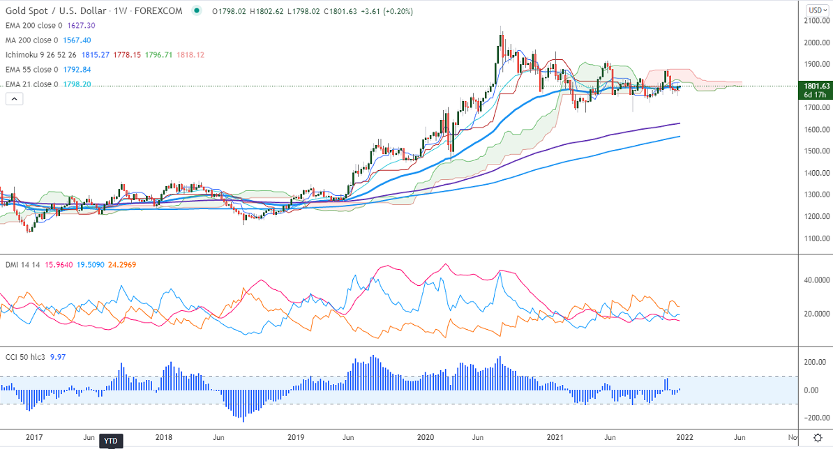 Gold lost more than $10 from a high of $1814 on the hawkish central bank. US central bank has kept its rate unchanged and doubled the size of tapering from $15 billion per month to $30 billion per month. Almost two-thirds of Fed members have projected two to three rate hikes in 2022. The Bank of England surprised markets by raising rates from a record low of 0.10% to 0.25% due to a jump in inflation. The US dollar index holding above 96.50, any breach above 97 confirms further bullishness. The yellow metal hits an intraday high of $1802.48 and is currently trading around $1801.87.