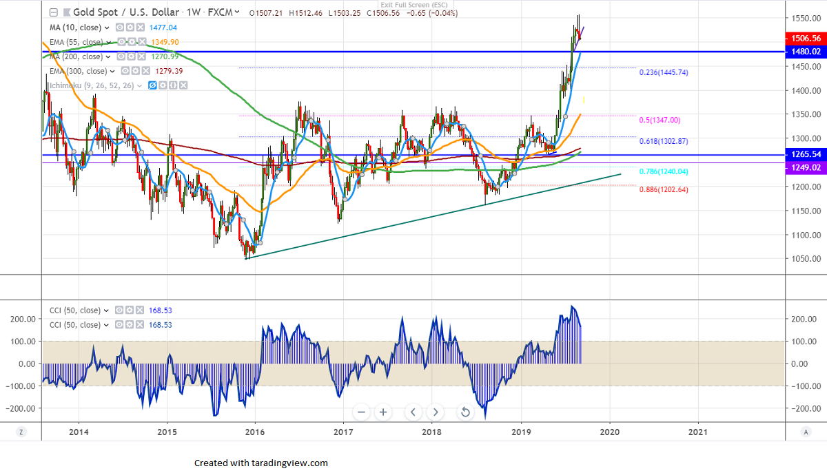 Gold is trading weak and lost more than $50 on Friday on slight easing of US-China trade war and good recovery in US bond yield. US 10 year bond yield shown a minor recovery of more than 13% after hitting a 3-year low. It is currently trading at 1.536%. The yield curve inversion between US 10 year and 2-year has gone and spread narrowed to 3 bps. It hits low of $1503.2 and is currently trading around $1504.75.