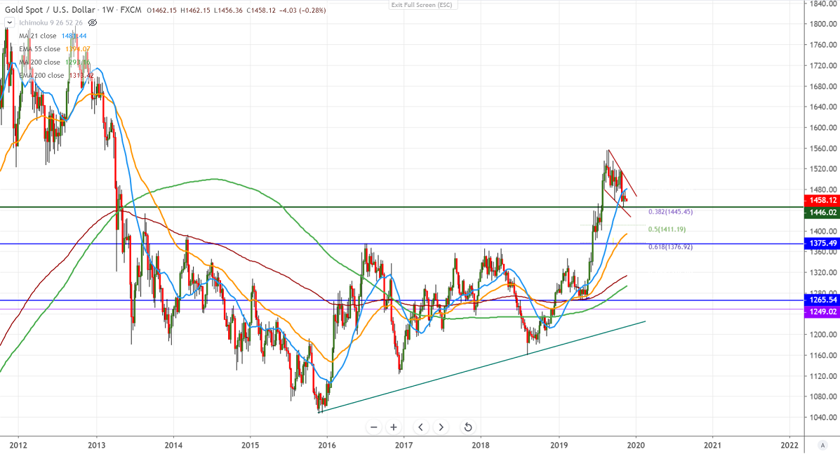 Gold is trading weak for 2nd consecutive days on strong US dollar and hopes of US-China trade deal. The US dollar index has formed a minor bottom near 97.60 and shown a good recovery till 98.31. the yellow metal hits high of $1478 previous week and is currently trading around $1458.