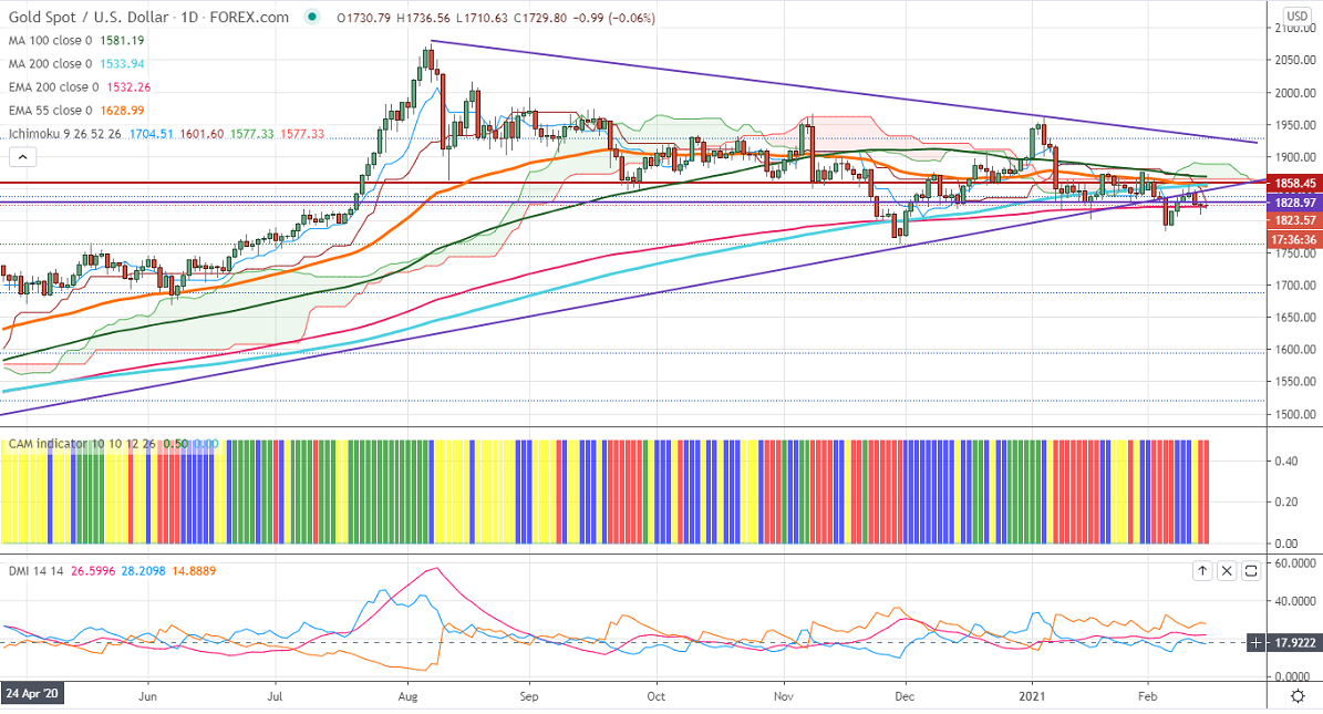 Gold is trading slightly lower after hitting a high of $1855 the previous week. The upbeat market sentiment due to progress in vaccination, hopes of more stimuli from the U.S is putting pressure on the yellow metal at higher levels. But lockdown restrictions in major countries such as Europe, Australia, and New Zealand are preventing gold from further selling. The US 10-year yield hits a fresh year high amid mixed US inflation data.