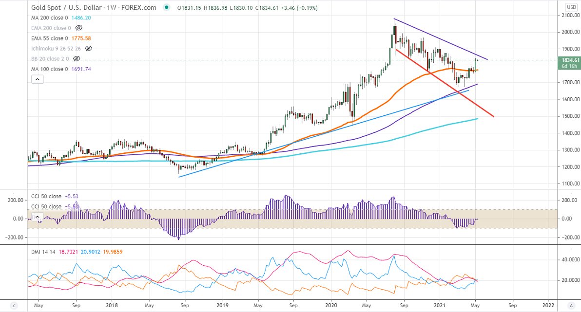 Gold jumped more than $70 on broad-based US dollar weakness. The US dollar index continues to trade lower for the fifth consecutive days and lost more than 300 pips on upbeat market sentiment and dovish comments by Fed chairman Powell. The minor pullback in US bond yields is putting pressure on yellow metal at higher levels. The US 10-year bond yield surged more than 8% from minor bottom 1.48%. the yellow metal hits a high of $1843 and is currently trading around $1834.