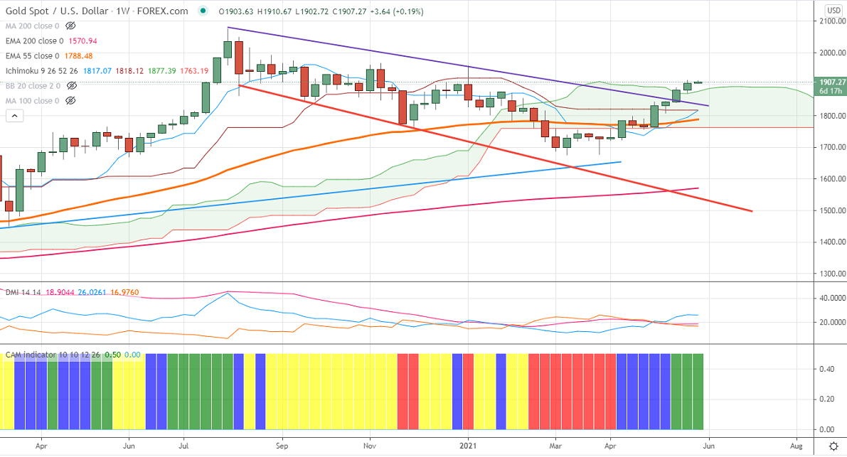 Gold is trading higher for a fifth consecutive week and surged more than 8% on board-based US dollar selling. The Fed member's comments show that the central bank is expected to continue accommodative despite higher inflation. The US 10- year yield continues to trade weak after a minor pullback. The US dollar index lost more than 50 pips after forming a minor top around 90.44. Gold hits a high of $1890 and is currently trading around $1884.12.