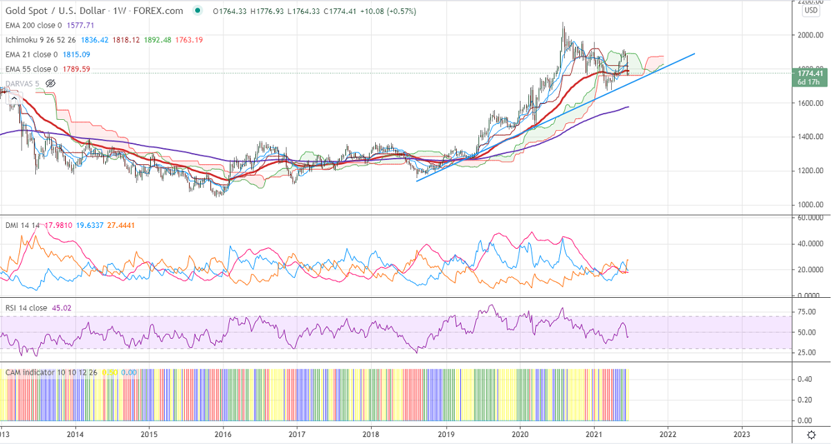 It is facing strong support at $1760, violation below targets $1740/$1720/$1700.Significant trend continuation only below $1675. On the higher side, near-term resistance is around $1800, any convincing break above will take the yellow metal to $1825/$1836/$1860 is possible.