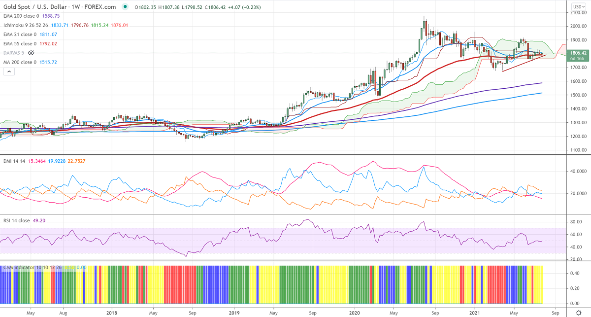 Gold is holding above $1800 levels despite the strong US dollar. The US dollar has shown a minor pullback from a low of 92.53. Any breach above 93.20 confirms further bullishness. Markets eye US Fed monetary policy and GDP data for further direction. The yellow metal has an intraday high of $1807 and is currently trading around $1806.10.