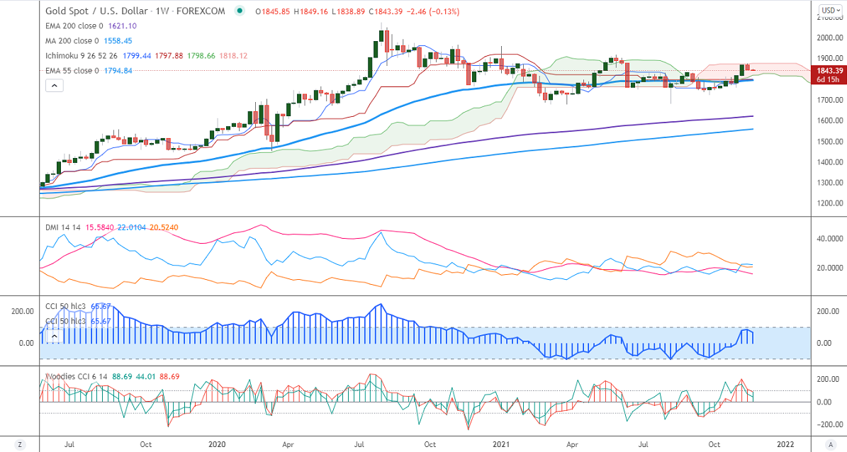 Gold continues to trade weak due to the rebound in the US dollar. The US dollar index is trading higher for a fifth consecutive week in hopes of a rate hike by the Fed. The minor pullback in US treasury yield also puts pressure on the yellow metal. It hits a low of $1838.85 and is currently trading around $1844.15.