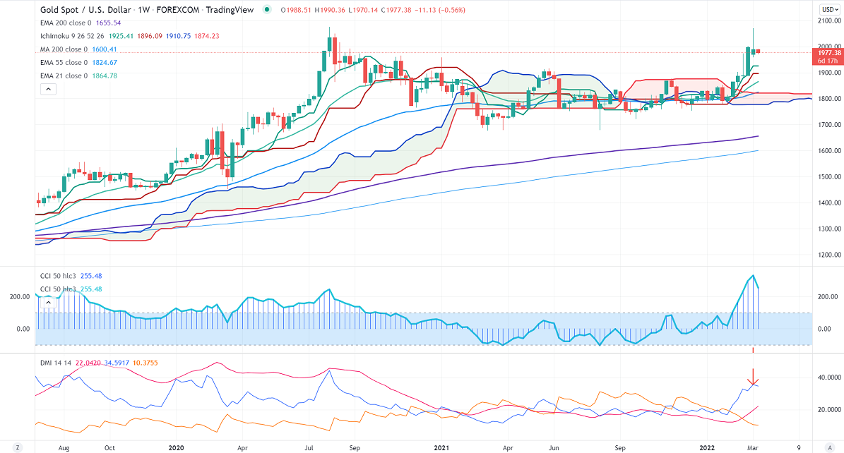 Gold continues to trade lower on de-escalation of tension between Russia and Ukraine. Markets await Fed monetary policy this week for further direction. Any 50 basis point rate hike will pull yellow metal don below $1900. Gold hits a low of $1958.75 and is currently trading around $1975.70. The gold downside is capped due to