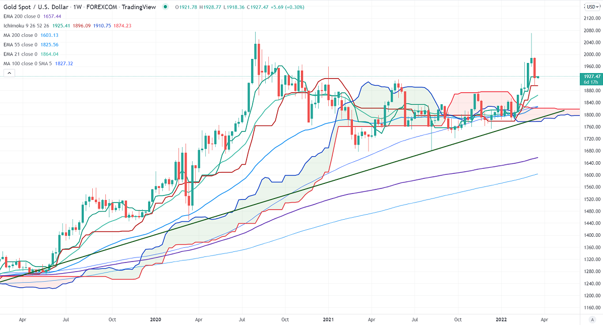 Gold showed a minor pullback on Russia and Ukraine tension. Ukraine has rejected Russia's demand to surrender port city Mariupol. The yellow metal was one of the worst performers the previous week on improved market sentiment that hampered demand for safe-haven assets. Gold hits a high of $1928.77 at the time of writing and is currently trading around $1927.94.