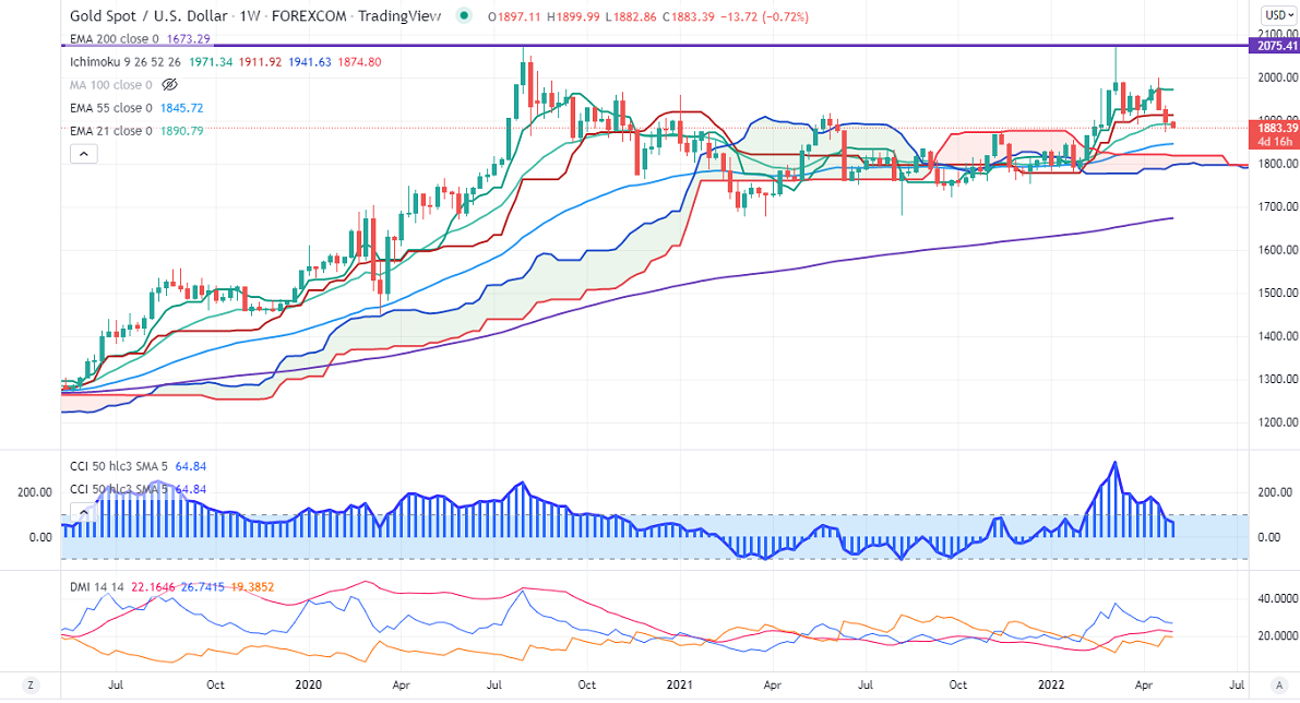 Gold continues to trade weak on the strong US dollar. Markets eye US Fed monetary policy this week for further direction. According to the Fed watch tool, the probability for a 50 bpbs rate hike in June has increased to 94.3% from 91.1% a week ago. US dollar index showed a profit booking after hitting a 20-year high in hopes of aggressive rate hikes. The yellow metal hits an intraday low of $1884 and is currently trading around $1885.