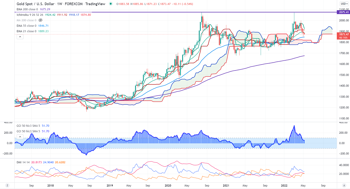 Gold consolidates in an arrow range between $1866 and $1892.50 for the past four days. Markets are highly volatile after major central bank decisions the previous week. RBA hiked rates by 25bpbs, Fed increased by 50 bpbs and Bank of England hiked by 25 bpbs for the fifth consecutive time. The surge in US bond yields and strong US dollar put pressure on the yellow metal at higher levels. It hits an intraday low of $1871.25 and is currently trading around $1872.42
