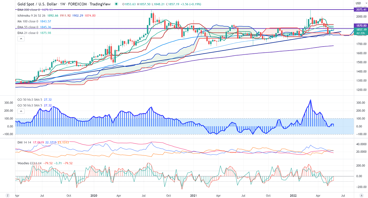 Gold holds above $1850 on dismal US economic data. US new home sales declined sharply by 16.6% and pending home sales dropped by 3.9%. US Fed meeting minutes show that there is a 100% probability of a second consecutive 50 bpbs rate hike in Jun. It hits a high of $18 and is currently trading around $1841.61.According to the CME Fed watch tool, the probability of a 50 bpbs rate hike dropped to 93.3% from 97.6% a day ago.