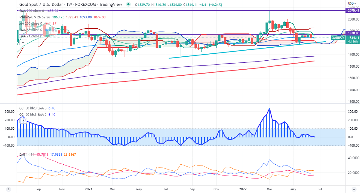 Gold traded in a narrow range the previous week despite hawkish Fed policy. The central bank hiked rates by 75bpbs, the biggest increase since 1994. The Fed's "dot plot" shows that the projection for the federal funds rate for this year moved to 3.4%. It has cut its GDP to 1.7% from 2.8% in 2022, 1.7% from 2.2% in 2023. US dollar index pared some of its gains after forming a top 105.08. The minor sell-off in US treasury yields also supports the yellow metal at lower levels. It hits a low of $1805 the previous week and is currently trading around $1844.10.