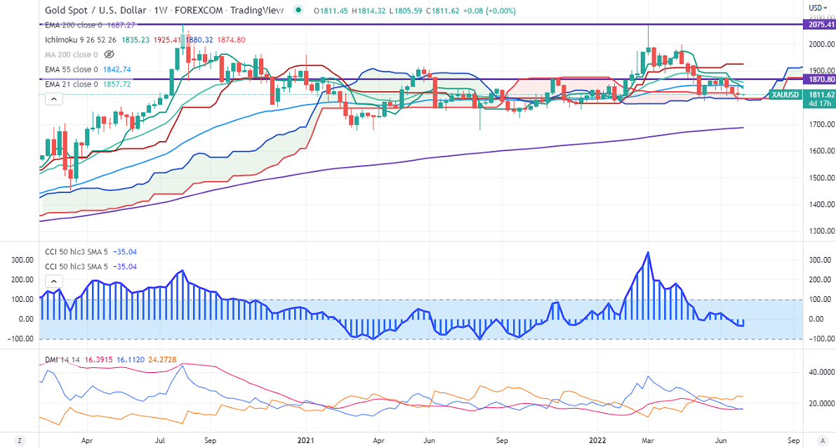 Gold price remained above $1800 on recession fears. The falling equity markets and yields support the yellow metal at lower levels. Markets eye US Fed meeting minutes and Nonfarm payroll for further direction. According to the CME Fed watch tool, the probability of a 75 bpbs rate hike in Jul rose to 85.6% from83.6% a week ago. It hits a high of $1814.32 and is currently trading around $1811.68.