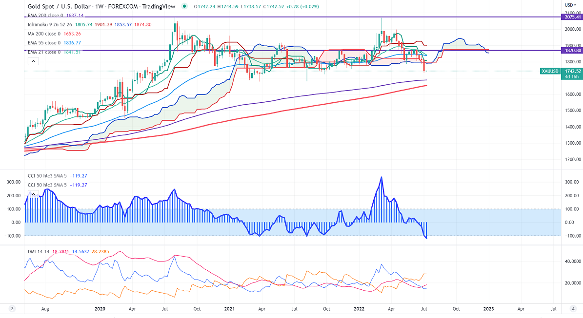 Gold price consolidating in a narrow range between $1732.32 and $1752.48 for the past three days despite robust US NFP data. US economy has added 372K jobs in June beating the forecast 260K. The upbeat jobs data has cooled off recession worries and increased the chance of aggressive rate hikes. According to the CME Fed watch tool, the probability of a 75 bpbs rate hike in Jul rose to 93% from 86.2% a week ago. The surge in the US dollar on recession fears puts pressure on the yellow metal. US dollar index regained above 107 level. Any violation above the recent high of 107.78 confirms a bullish continuation.