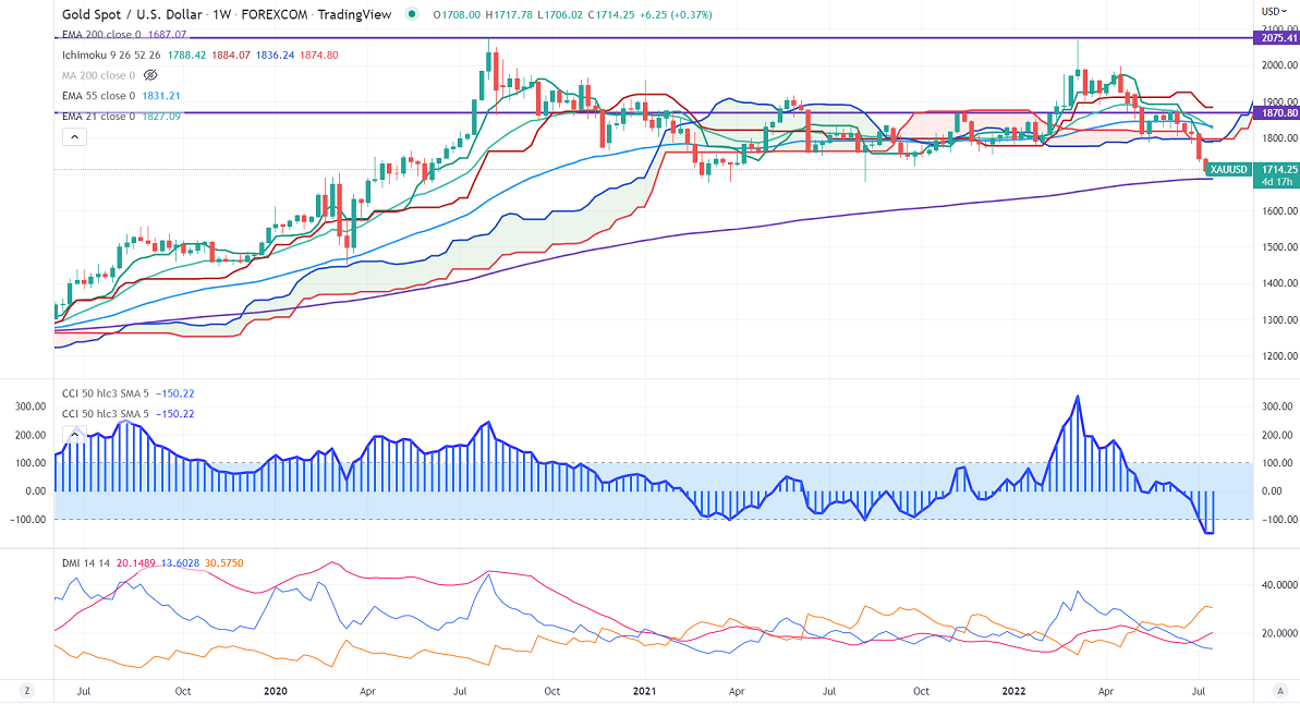 Gold price lost its shine the previous week after surging US inflation. US CPI hits a 40-year high at 9.1% yearly in June compared to market expectations of 8.8%. US retail sales rose by 1% m/min June compared to a forecast of 0.70% The number of people who have applied for jobless benefits rose by 9000 last week to 244000 compared to a forecast of 235000. US dollar index showed a profit booking after hitting a multi-year high of 109.29. According to the CME Fed watch tool, the probability of a 75 bpbs rate hike in Jul dropped to 71.5% from 92.4% a day ago.
