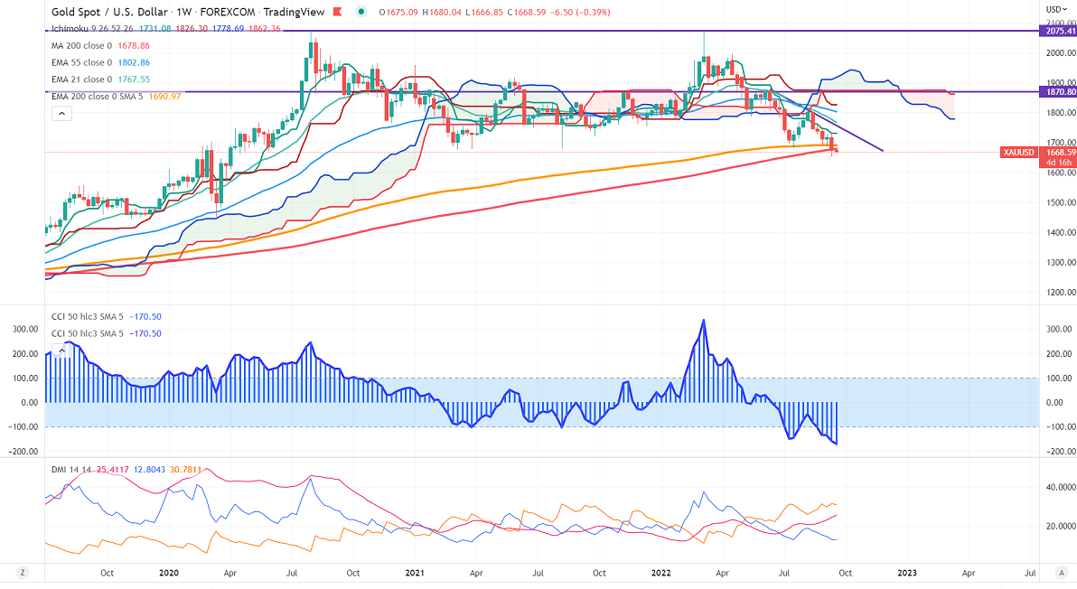 Gold is trading weak for the second week on surging US treasury yields. The yellow metals lost their shine on expectations of a 75 bpbs rate hike by the Fed. The US inflation for Aug dropped to 8.3% YoY Compared to a forecast of 8.1%. Core CPI surged 0.6% over the month, to an annual rate of 6.3.US retail sales rose 0.3% mom, above expectations of 0%. Core sales ex-auto dropped -0.3% mom vs. estimate of 0%. US NY Fed empire state manufacturing index improved to -1.5 in Sep vs forecast of-12.70