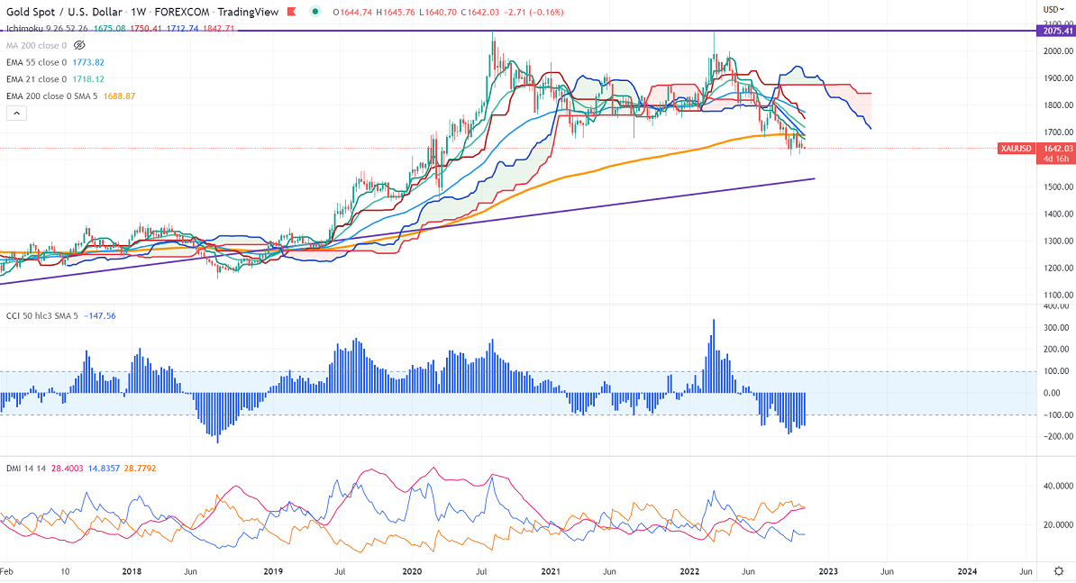 Gold is trading weak and holds below $1650 ahead of Fed monetary policy. The European central bank and Bank of Canada raised by 75 bpbs and 50 bpbs respectively. Markets eye US Fed monetary policy and US Non-farm payrolls data for further direction. Any hawkish rate hike by Fed will drag the yellow metal further lower. The yellow metal hits a low of $1638.12 and is currently trading around $1644.04.