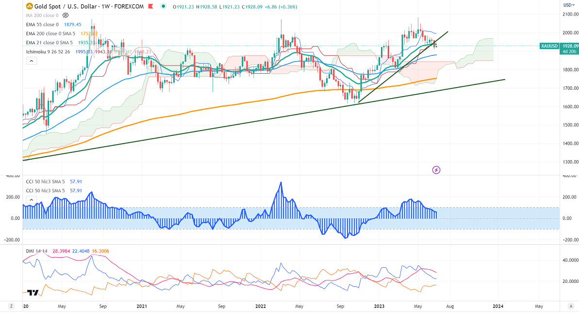 Gold was one of the worst performers the previous week and lost more than $ 40 on upbeat market sentiment. US Fed Chairman Powell said in testimony that the central bank will continue to hike rates cautiously to tackle inflation. It hits a low of $1910.40 and currently trading around $1928.