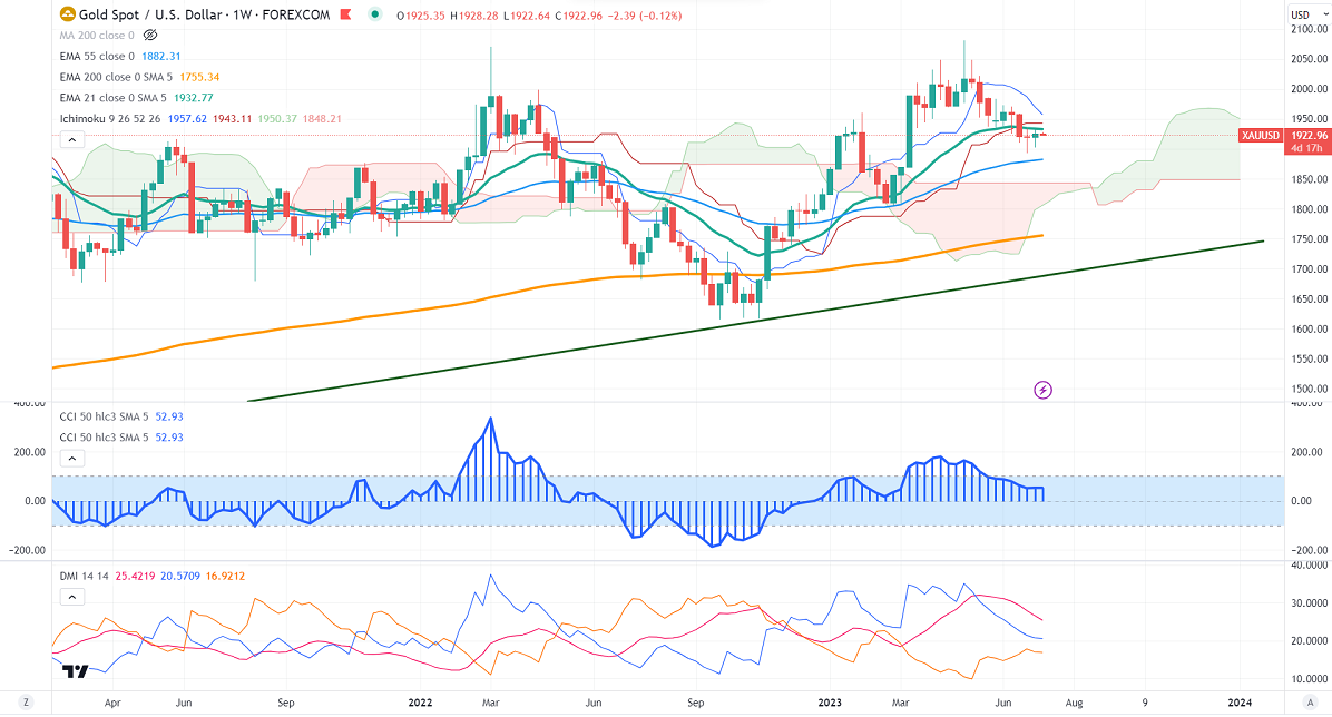 Gold prices showed a minor pullback after weak US jobs data. The US economy added 209000 jobs in June, the lowest since Dec 2020. The unemployment rate declined to 3.6% from 3.7%. Average hourly earnings jumped 0.40% m/m, above the forecast of 0.30%. It hits a high of $1934.50 and currently trading around $1923.12.