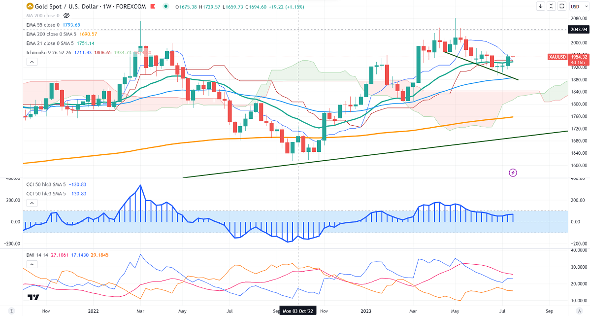 Gold prices showed a minor sell-off after a $50 jump from a low of $1912. The yellow metal gained sharply after weak US inflation. It hits a high of $1963.42 and currently trading around $1952.30.