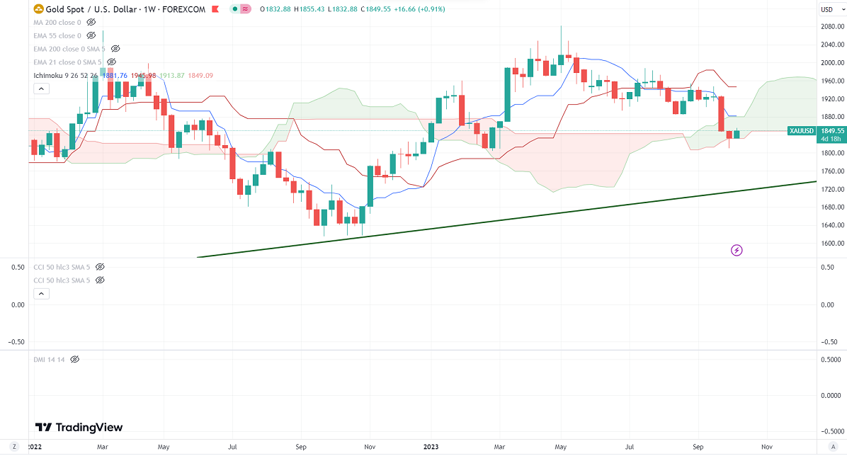 Gold showed a big gap in the Middle East conflict. It hit a high of $1855 at the time of writing and is currently trading at around $1851.40. the US economy has added 336000 jobs in Sep, compared to a forecast of 170000. The unemployment rate surged to 3.8% vs. an estimated 3.70%.