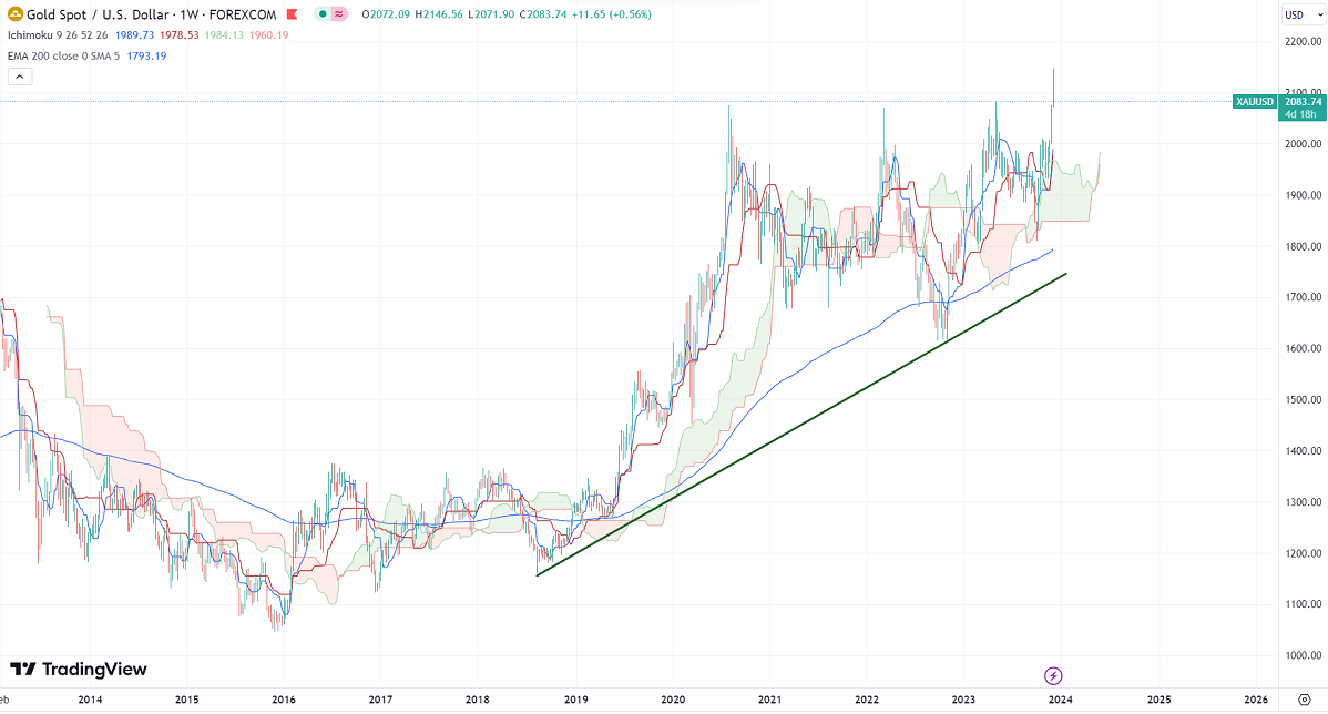 Gold hits an all-time high despite hawkish comments from the Fed. It hit a high of $2146 and is currently trading around $2086.59.
