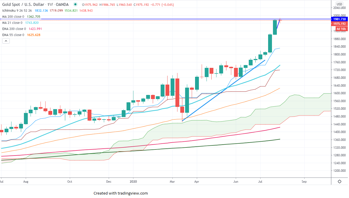 Gold is trading higher for 2nd consecutive week and jumped more than $180 on safe-haven demand. The yellow metal hits an all-time high at $1991 and is currently trading around $1972. The US dollar index recovered more than 100 pips after hitting a 26-month low at 92.55. The US real GDP declined by historic 9.6% in the second quarter compared to -5.0% in the first quarter. The continuing claims rose above 17 million and the number of people applied for unemployment benefits rose for the second consecutive week.