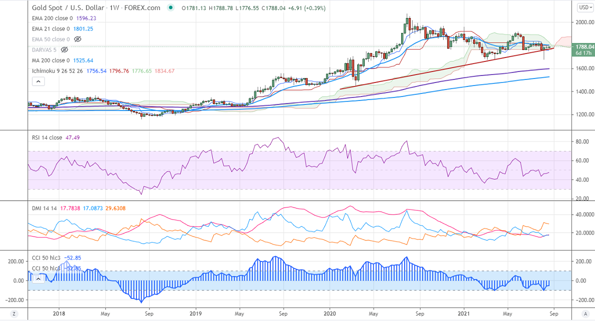 Gold is trading in a narrow range between $1770 and $1795 in the past week. The surge in the US dollar is putting pressure on yellow metal at higher levels. It is struggling to break above $1800 and is currently trading around $1787.30.