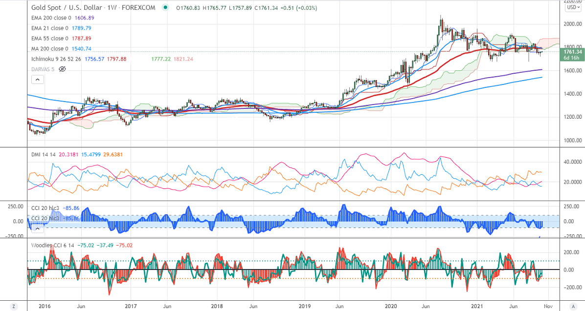 Gold has shown a nice recovery of more than $40 from the previous week's low of $1722 on rising crude oil prices. The risk of inflation fears on jump in energy costs is supporting the yellow metal at lower levels.DXY has started to decline after four weeks of the continuous uptrend. Any breach below 93.69 confirms further bullishness. The yellow metal hits an intraday high of $1765.77 and is currently trading around $1761.45.