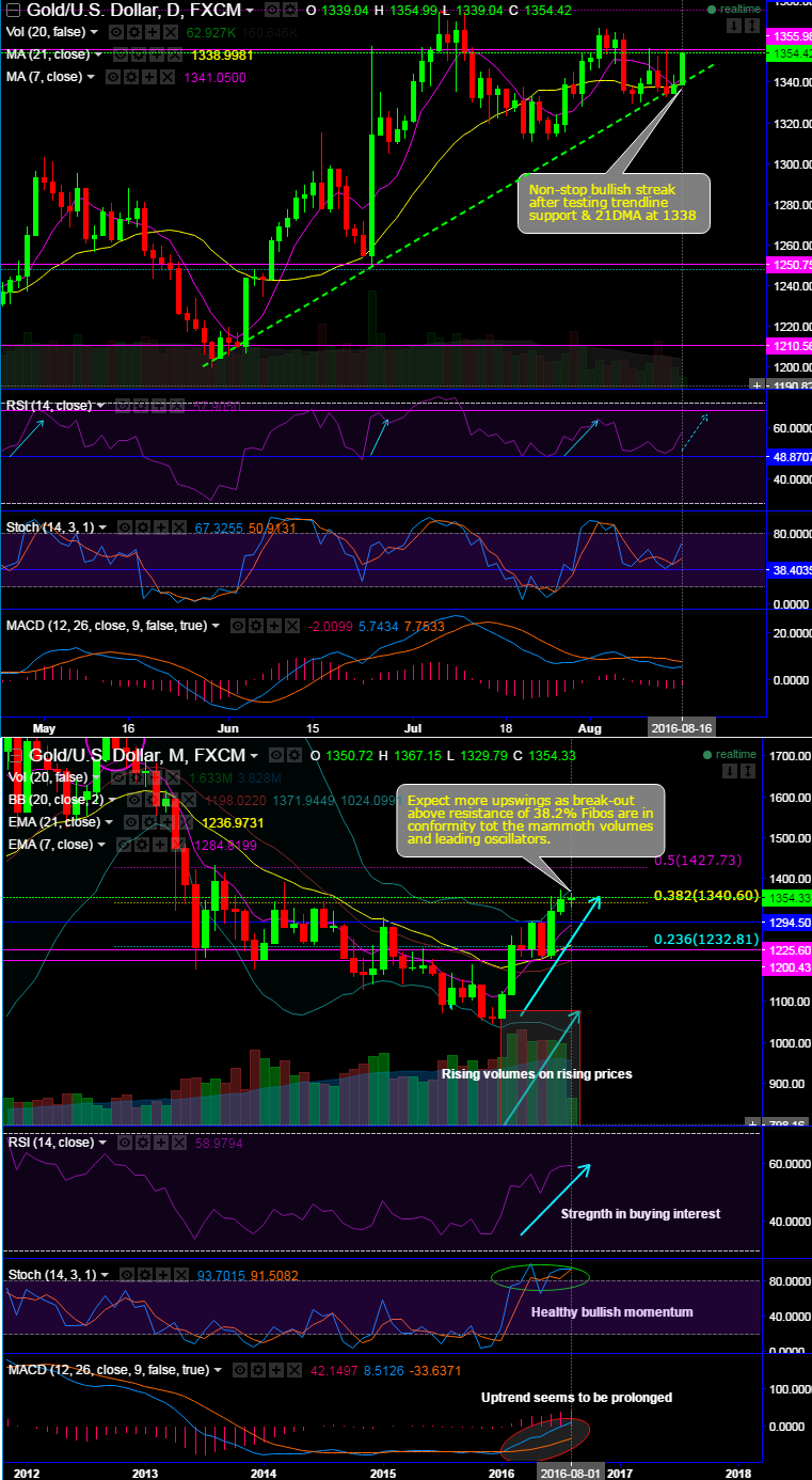 Gold prices resume non-stop bullish streaks soon after testing trend line support & 21DMA at 1338.