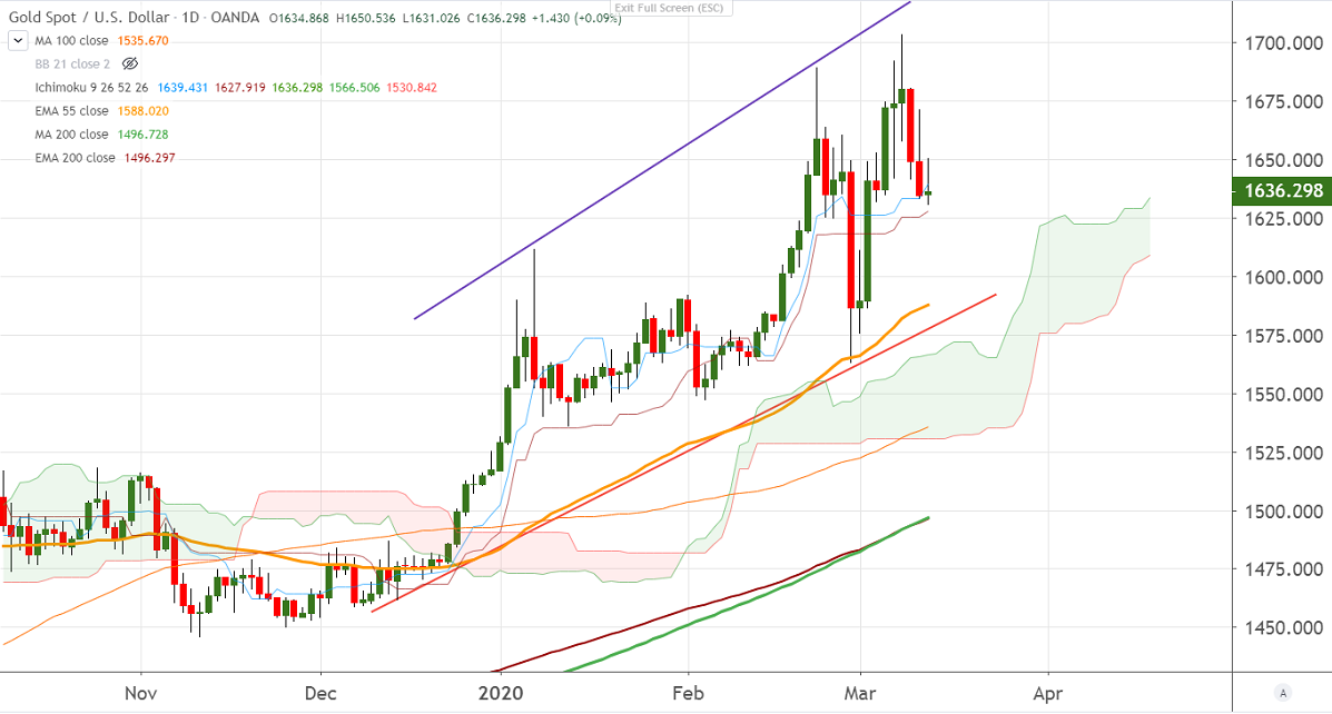 Gold is trading weak and lost nearly $70 from high $1704 on US dollar strength and jump in US bond yield. US markets declined more than 10% in the past two days as coronavirus will impact global growth. The demand for safe-haven assets will increase due to global uncertainty. The yellow metal hits an intraday low of $1631 and is currently trading around $1636.30.