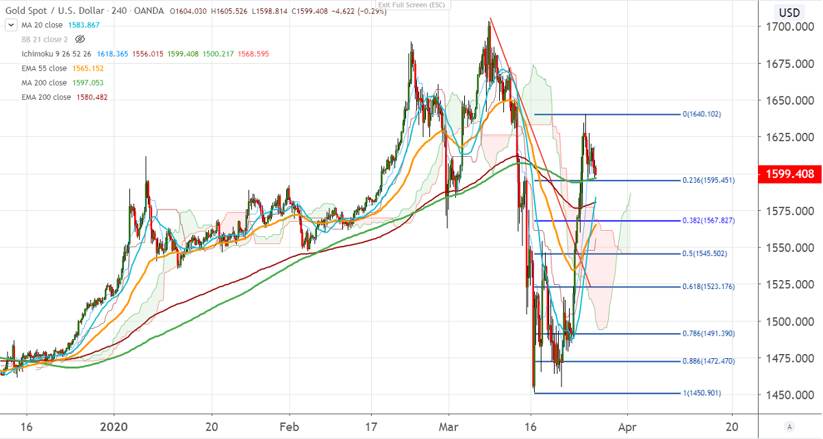 Gold has shown a minor decline after hitting a high of $1640. The slight improvement in demand for riskier assets is putting pressure on yellow metal at higher levels. US stocks surged for 2nd consecutive days with Dow Jones 21200 (2.39%) and S&P500 2475 (1.15%). The U.S Senate has passed a $2tn coronavirus disaster bill. DXY continues to trade lower after forming a top around 102.99 and is currently trading around 100.75.
