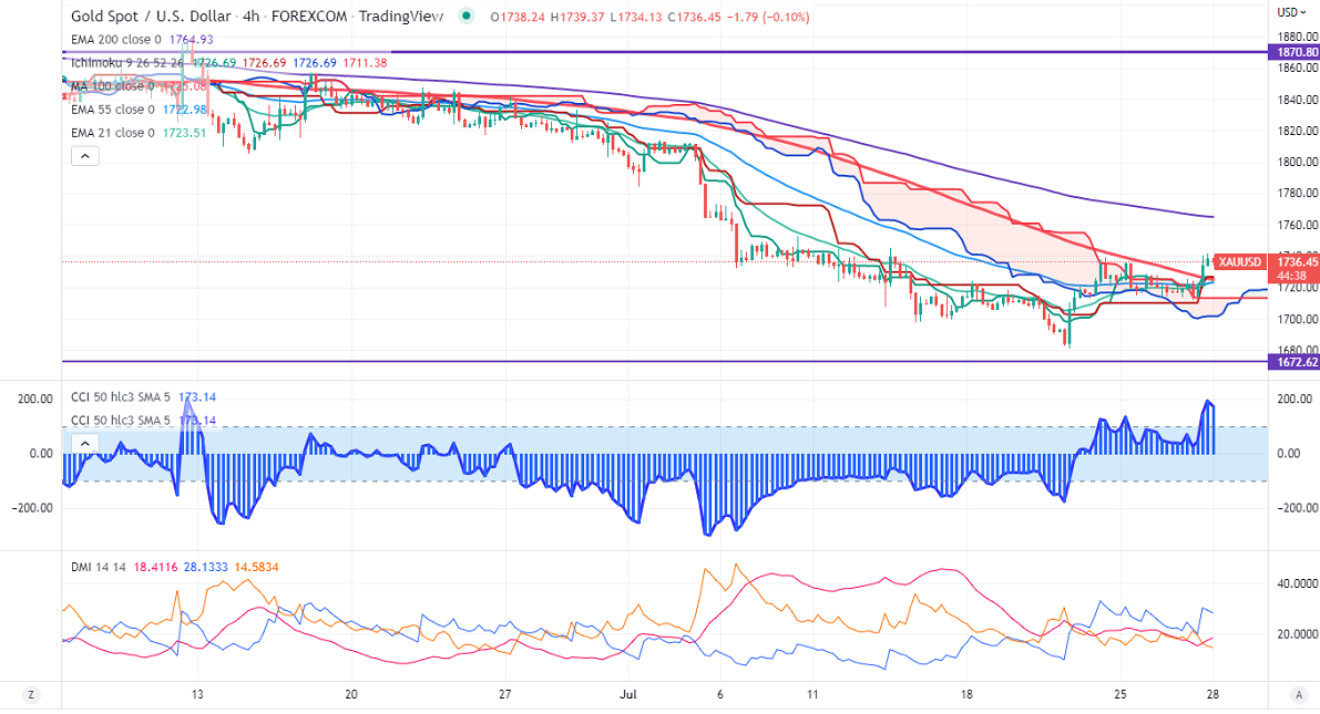 Gold price gained more than $15 after Fed monetary policy. The central bank hiked interest rates by 75 bpbs for the second consecutive month since 1980 and said that recent indicators of spending and production have "softened". According to the fed, the job market remains robust and inflation remains elevated. The committee will monitor the implications of incoming information for the economic outlook. US dollar index pared most of its gains after dovish US fed policy. According to the CME Fed watch tool, the probability of a 50 bpbs rate hike in Sep dropped to 34% from 41.2% a day ago.