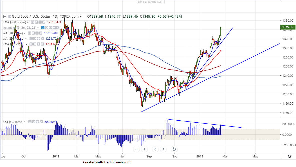 Gold is trading higher for 5th consecutive day and jumped nearly $25 in past two trading session.Gold was one the best performer in Jan and has jumped more than $50 on account of dovish Fed and global uncertainty.