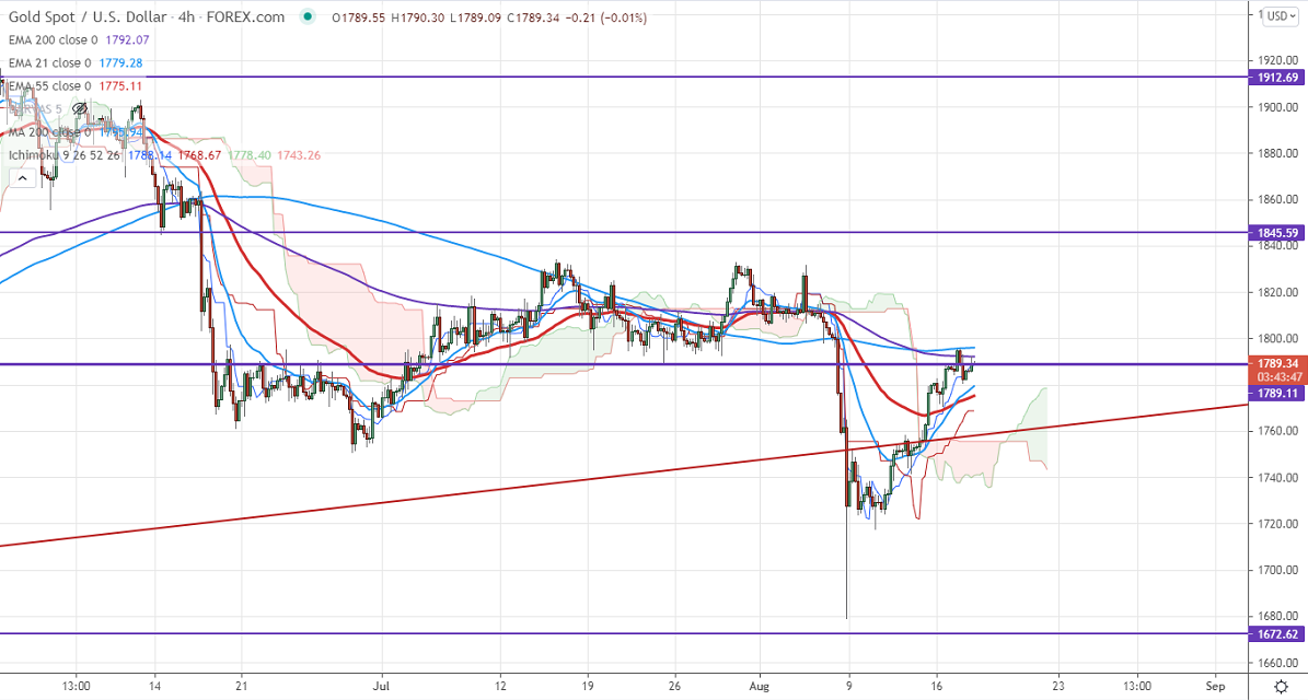 Gold is trading higher for the past four days inching towards the $1800 mark despite the strong US dollar. The US retail sales have dropped by 1.1% in July compared to a forecast of -0.2%. But the jump in delta variant cases across the globe has increased demand for safe-haven assets like yen and gold. The US 10-year bond yield recovered more than 5% is preventing the yellow metal from further upside. The Yellow metal hits an intraday high of $1792 and is currently trading around $1788.80. Market eyes US Fed meeting minutes for further direction.